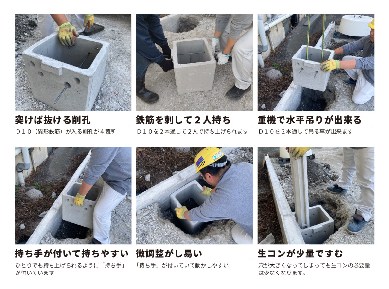 フェンスウォールの柱を建てる時、決められた基礎寸法を確保する為にちょうどよい大きさのを掘るのが大変でした。掘った穴が小さければ基準を満たせず、逆に大きければ流し込むコンクリートが大量に必要です。専用基礎を使用すれば無駄なく決められた基礎寸法をクリアする事が出来ます。