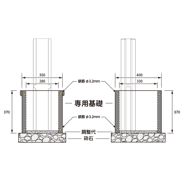 ※ 3番柱を使用した盛土高さ600mm以上の土留め施工の場合は基礎寸法が変わります